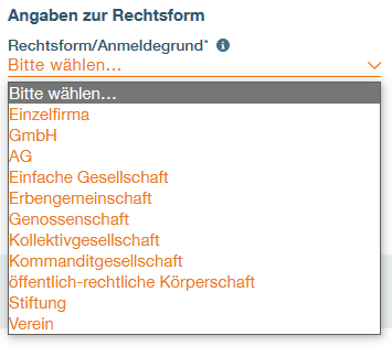 • Auswahl der Rechtsform, folgende Formen stehen zur Auswahl: