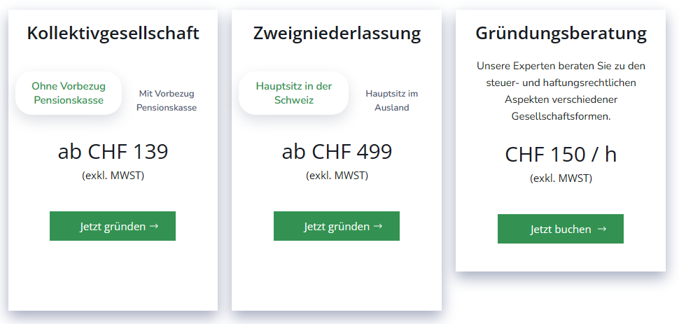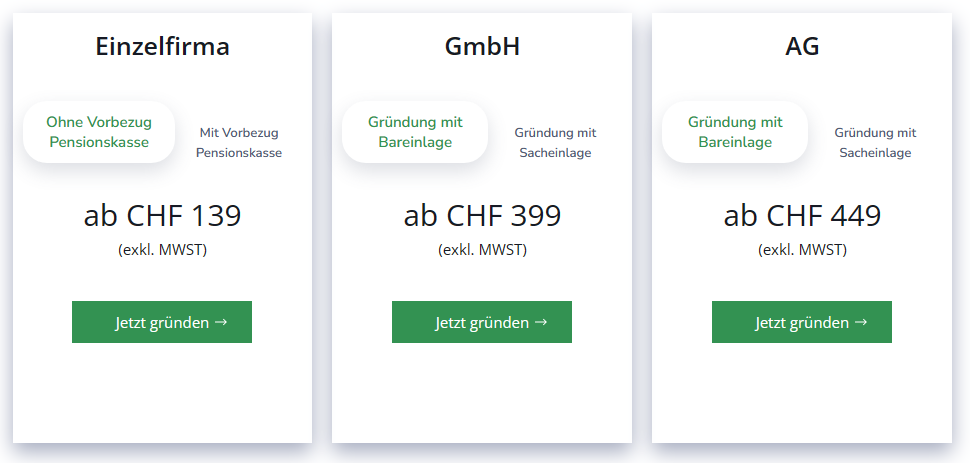 Neben der Anmeldung einer Einzelfirma gibt es natürlich auch noch andere Rechtsformen wie zum Beispiel die Gründung einer GmbH oder einer Aktiengesellschaft. Dabei war ich positiv überrascht, dass auch solche Firmengründungen in der Schweiz komplett online funktionieren. Auch dazu habe ich im Internet recherchiert und kann dir folgende Anbieter zum gründen empfehlen: