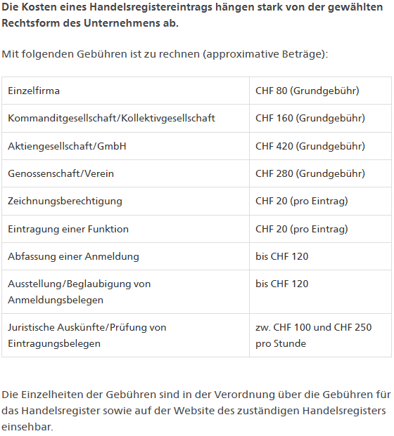 Beim Handelsregisteramt muss man je nach Fall mit Kosten von CHF 200.– bis ca. CHF 300.– rechnen.