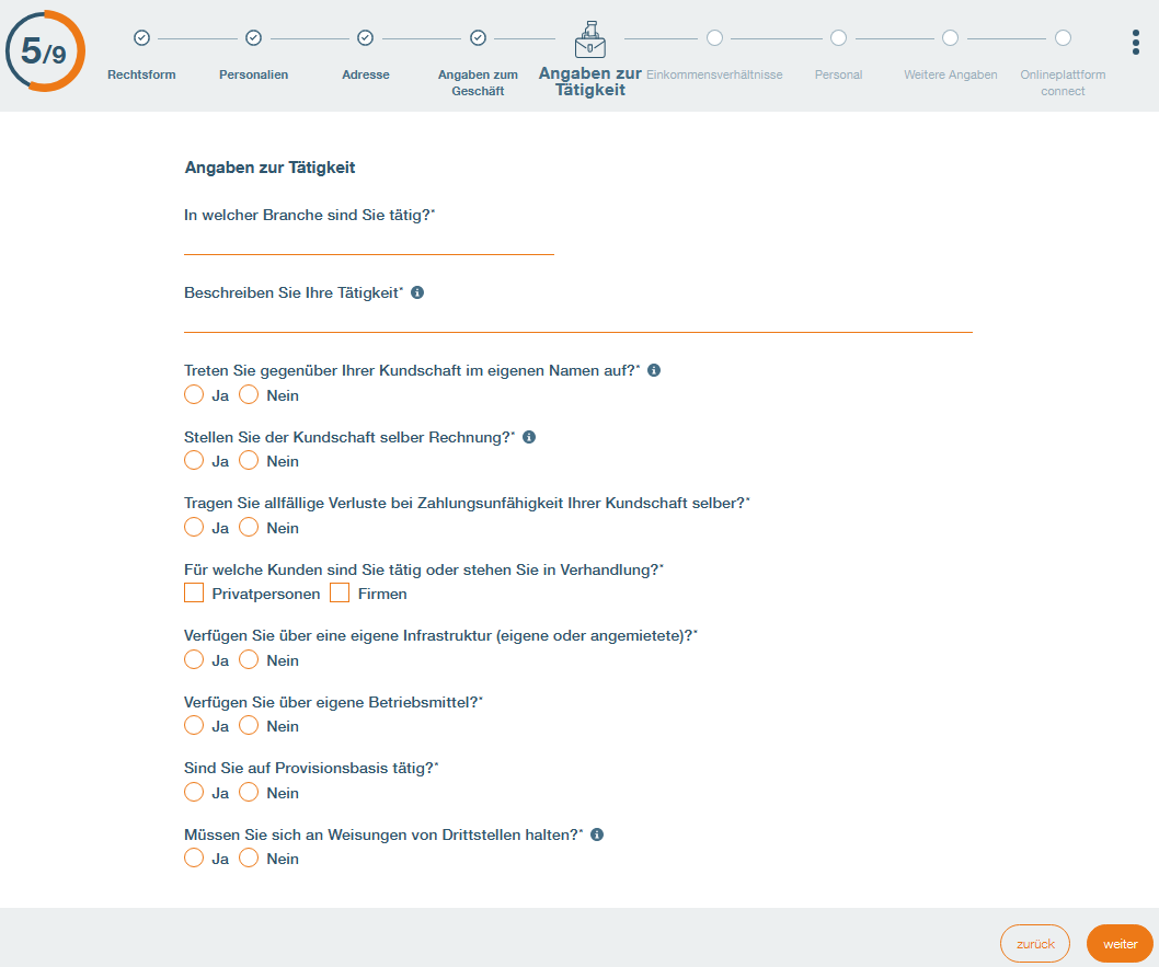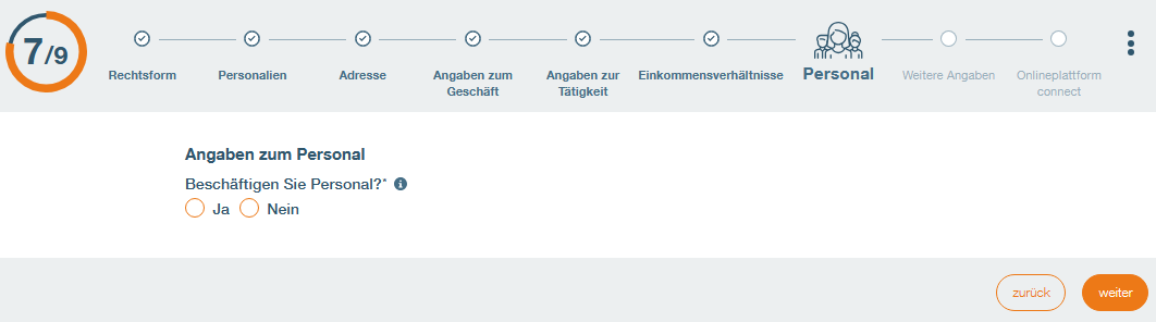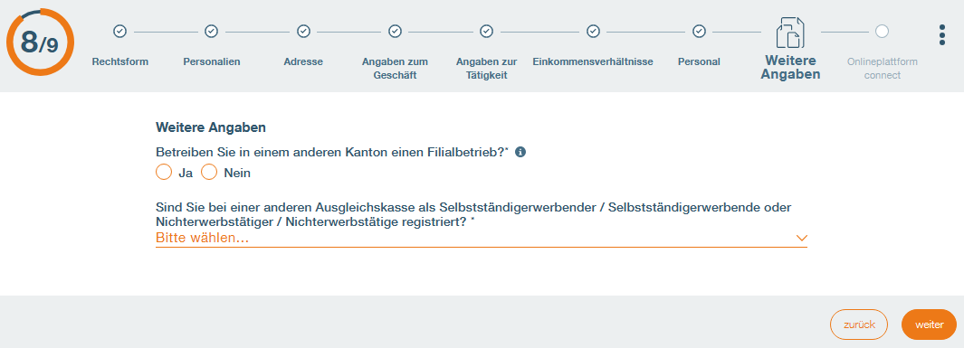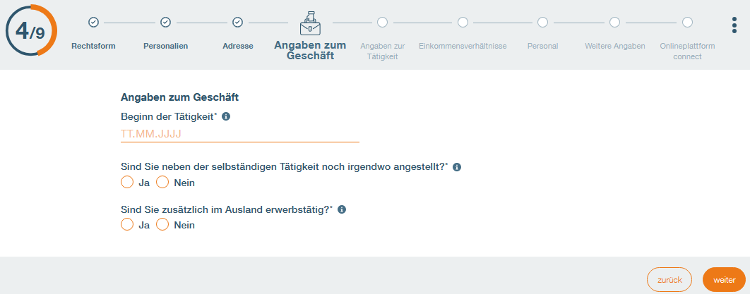 • Falls man die Selbständigkeit als Nebenerwerb plant, muss hier das entsprechende Feld ausgewählt werden